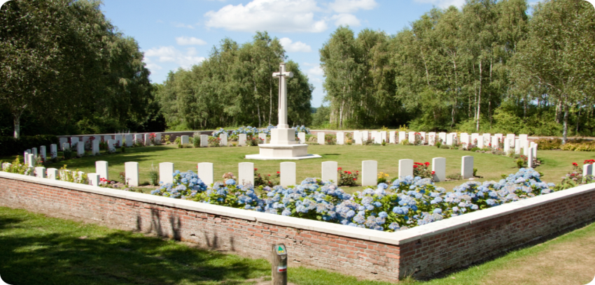 We wandelen naast de drie Britse begraafplaatsen in het bos, stille getuigen van de WOI. Kort na de oorlog werd het als eerste bos in de Ieperboog heraangeplant. Onderweg een korte toelichting over het domein, vóór, tijdens en na de eerste Wereldoorlog.