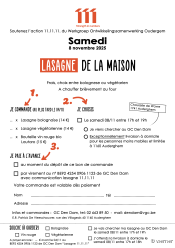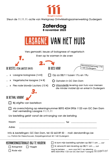 Steun de 11.11.11.-actie van de Werkgroep Ontwikkelingssamenwerking Oudergem. Vers gemaakte lasagne aan 14 euro per portie.