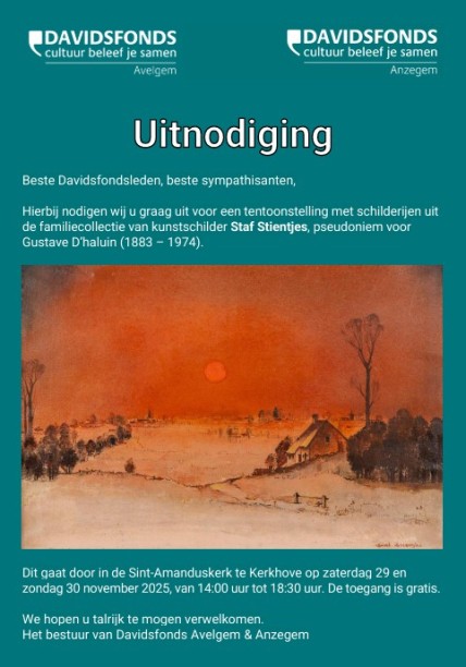 Het Davidsfonds Avelgem en Davidsfonds Anzegem nodigen u met veel plezier uit op een unieke tentoonstelling rond het leven en werk van Staf Stientjes, pseudoniem van Gustave D’Haluin (Waregem, 14 december 1883 – Tiegem, februari 1974).