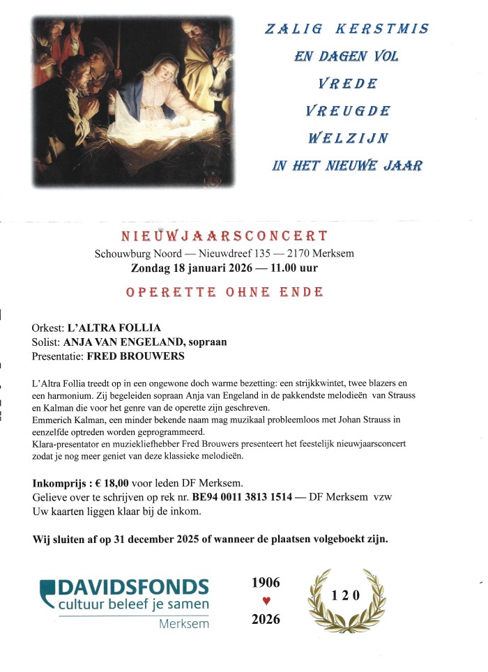18 jan Merksem - Schouwburg Noord # 9793 Nieuwjaarsconcert Jaarlijkse nieuwjaarsbegroeting zondag 18 januari 2026 om 11:00 uur Over Sprekers Locatie Aanmelden Labels: Kunst & CultuurMuziek1 sessieNederlands | A1/A2 basisgebruikerConcertCultuurregio Antwerpen