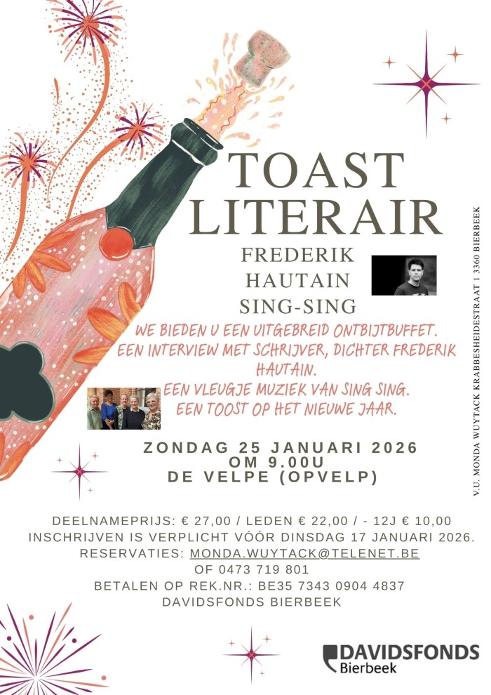 We bieden u een uitgebreid ontbijtbuffet.Het verhaal van Frederik Hautain, schrijver, dichter en scenarist. Hij is wars van hokjes en graag op diverse fronten actief. Van zijn hand verschenen eerder de graphic novels De Walvis in 2019 (met tekenwerk van Hanne Dewachter) en in 2023 Meisjes van Medusa (met tekenwerk van Lode Peeters), en de dichtbundel Sterrenwacht. Hij komt terug is zijn romandebuut. Zijn allernieuwste roman Wachtkamer geeft zijn persoonlijke inkijk over opgroeien binnen een godsdienst die alles belooft, maar ook alles eist. Hij studeerde Germaanse Talen aan de KU Leuven.Op 9 oktober komt zijn nieuwe roman 'Wachtkamer' uit. Een vleugje muziek van Sing Sing.Sing Sing zijn vier super enthousiaste dames die mekaar vonden met hun passie voor zingen. Zij brengen hun mooiste a capella songs.Een toast op het nieuwe jaar.Deelnameprijs: € 27,00 / leden € 22,00 / - 12j € 10,00Inschrijven is verplicht vóór dinsdag 17 januari 2026via monda.wuytack@telenet.be of 0473 719 801Inschrijving is pas geldig na betaling op rek.nr. : BE35 7343 0904 4837 Davidsfonds Bierbeek