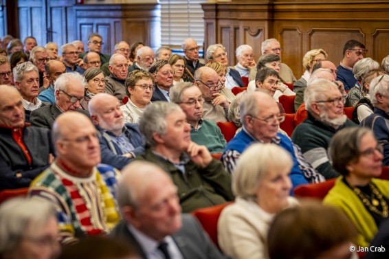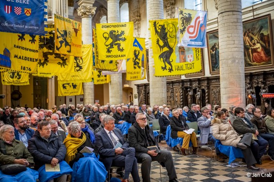 Om 15.00 uur startte in de Promotiezaal de academische zitting. Na een warme introductie door regiocoördinator Margot Thysens en verwelkoming door algemeen directeur Kris Opdedrynck en burgemeester Mohamed Ridouani, schetste minister-president Matthias Diependaele het bredere belang van 150 jaar Davidsfonds. Historicus Edward De Maesschalck nam het publiek mee doorheen de rijkgevulde geschiedenis van de organisatie, afgewisseld met sfeervolle muzikale